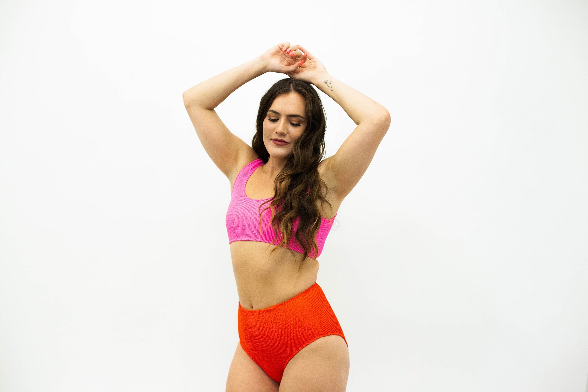 Swimwear designed and sewn in Vancouver, Canada using high quality ultra stretchy Crinkle fabric sourced in Los Angeles. Our swimwear is un-lined, un-padded, one-sized and really comfy.